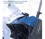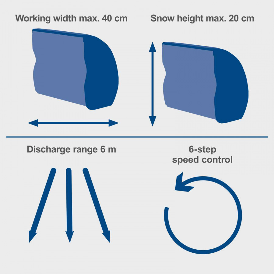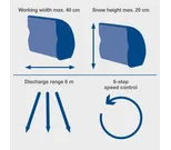 Snön kan kastas åt vänster, höger eller rakt fram, och med 6-stegs hastighetsreglering anpassar du enkelt arbetet efter snödjup och snötyp. Den klarar snödjup upp till 20 cm, har en arbetsbredd på 40 cm och en kastlängd på upp till 6 meter.
