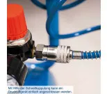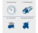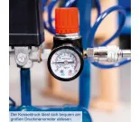 Praktiska extrafunktioner: Utrustad med avtappningsventil för kondens, tryckregulator med manometer och snabbkoppling för smidig användning.
