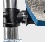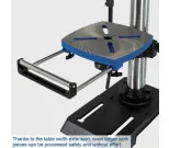 Jämfört med DP19VARIO från scheppach har DP18VARO ett större borrbord, som standard är utrustat med en bordsförstoring. Det 240 x 240 mm stora bordet har ett maximalt avstånd till borrchuck på 325 mm. Detta avstånd kan minskas steglöst. Dessutom kan borrbordet lutas åt båda sidor med 45°.