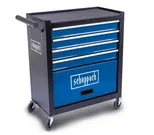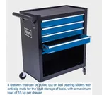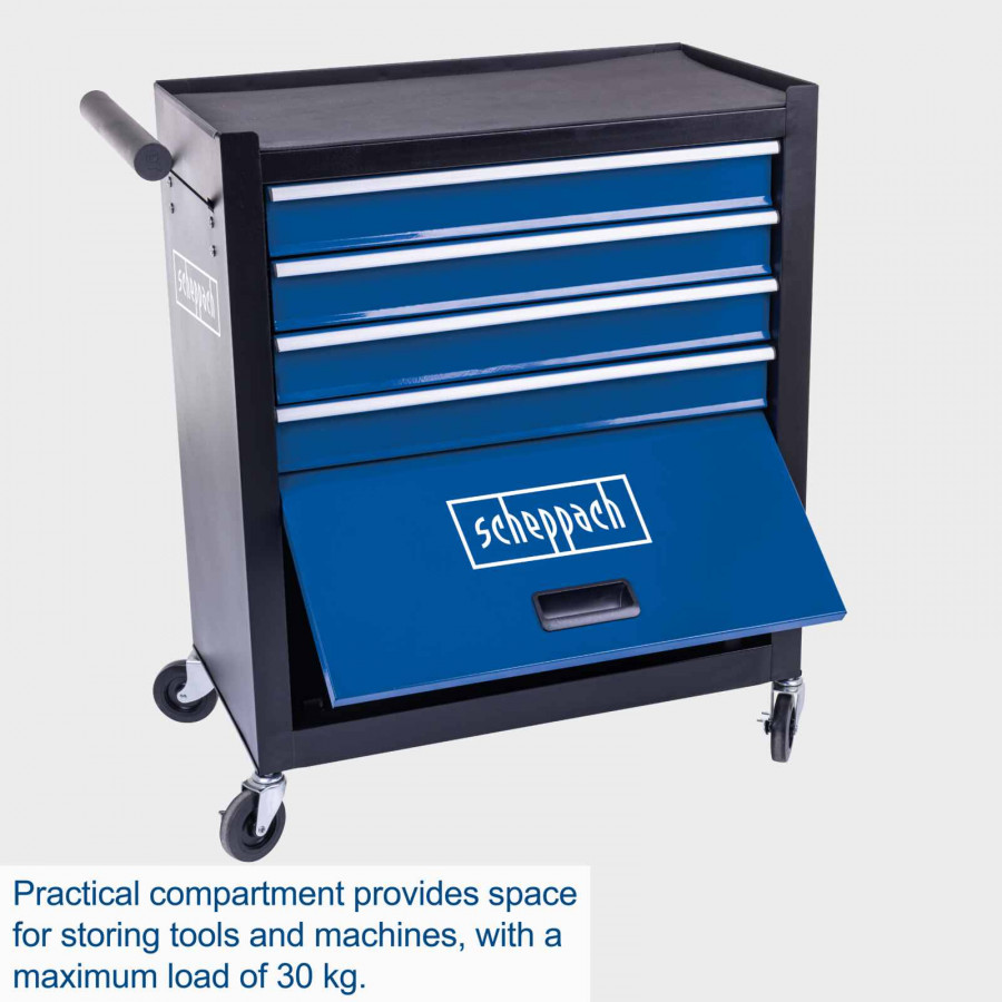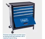 Verktygsvagnen är utrustad med fyra rymliga lådor som löper lätt på kullagrade skenor. Varje låda har halkskyddsmattor som håller verktygen på plats och klarar en belastning på upp till 15 kg per låda. Ovanpå vagnen finns en stor förvaringsyta för maskiner och ofta använda verktyg.
