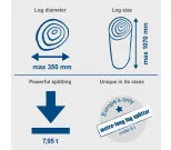 8 tons vedklyv som klyver ved upp till 1070 mm lång och upp till 320 mm i diameter. Maskiner finns i tillverkarens lager, leverans i mitten av juni.