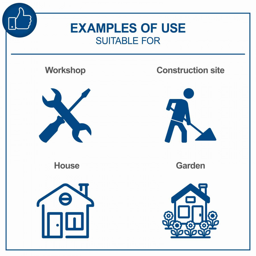 Kapea ja alumiininen runko soft-grip-kahvalla tekee työskentelystä mukavaa myös ahtaissa paikoissa. Kolmeen asentoon säädettävä etukahva, jossa on liukumaton pinnoite ja säilytystila mukana tulevalle avaimelle, parantaa käyttömukavuutta ja turvallisuutta.