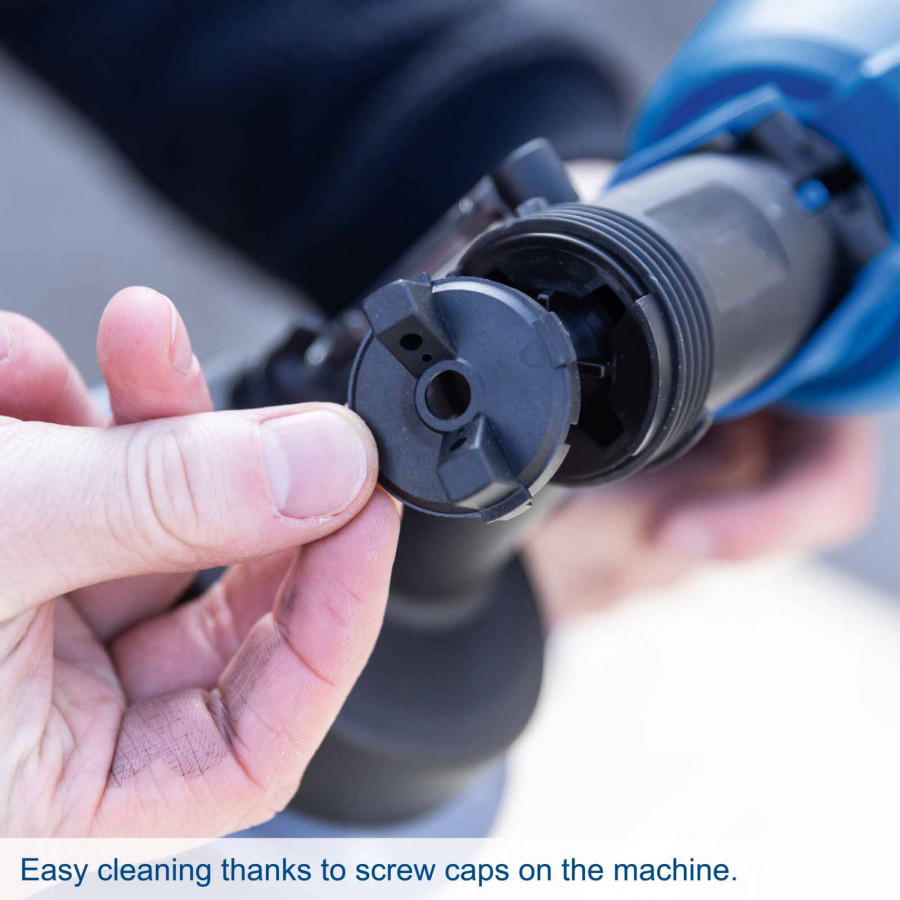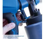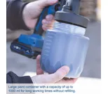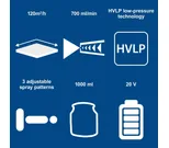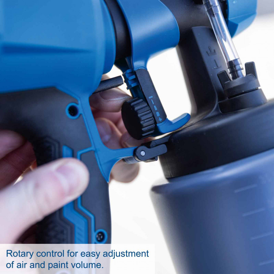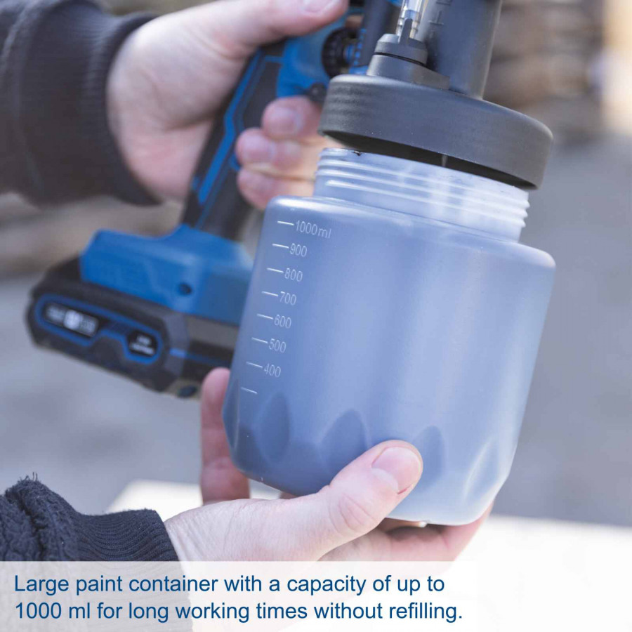 Säädettävien ruiskutuskuvioiden ja ilman sekä maalin määrän säätimen ansiosta voit mukauttaa laitteen helposti eri materiaaleille ja käyttökohteille. Suuri 1000 ml säiliö mahdollistaa pidemmän työskentelyn ilman keskeytyksiä.