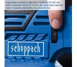 Hiiliharjamoottori tarjoaa luotettavaa suorituskykyä, ja säädettävä värähtelytaajuus (14 000 – 24 000 min⁻¹) mahdollistaa työskentelyn eri materiaaleille optimaalisella teholla. Kompakti rakenne ja matala korkeus tekevät hionnasta tarkkaa myös reunoja lähellä.