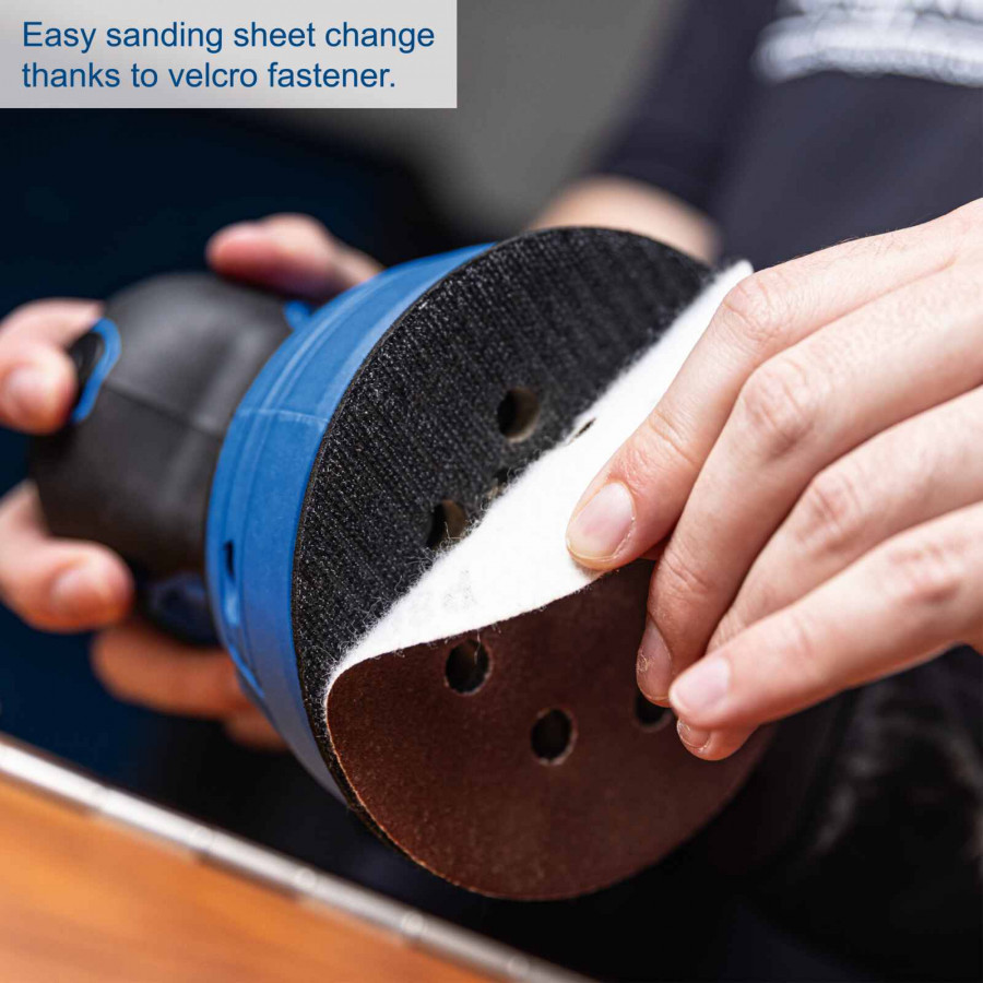 Pehmeä käynnistys lisää käyttömukavuutta, ja pölysuojattu kytkin pidentää laitteen käyttöikää. Tarrakiinnitteinen hiomapaperi tekee vaihdosta nopeaa ja helppoa.