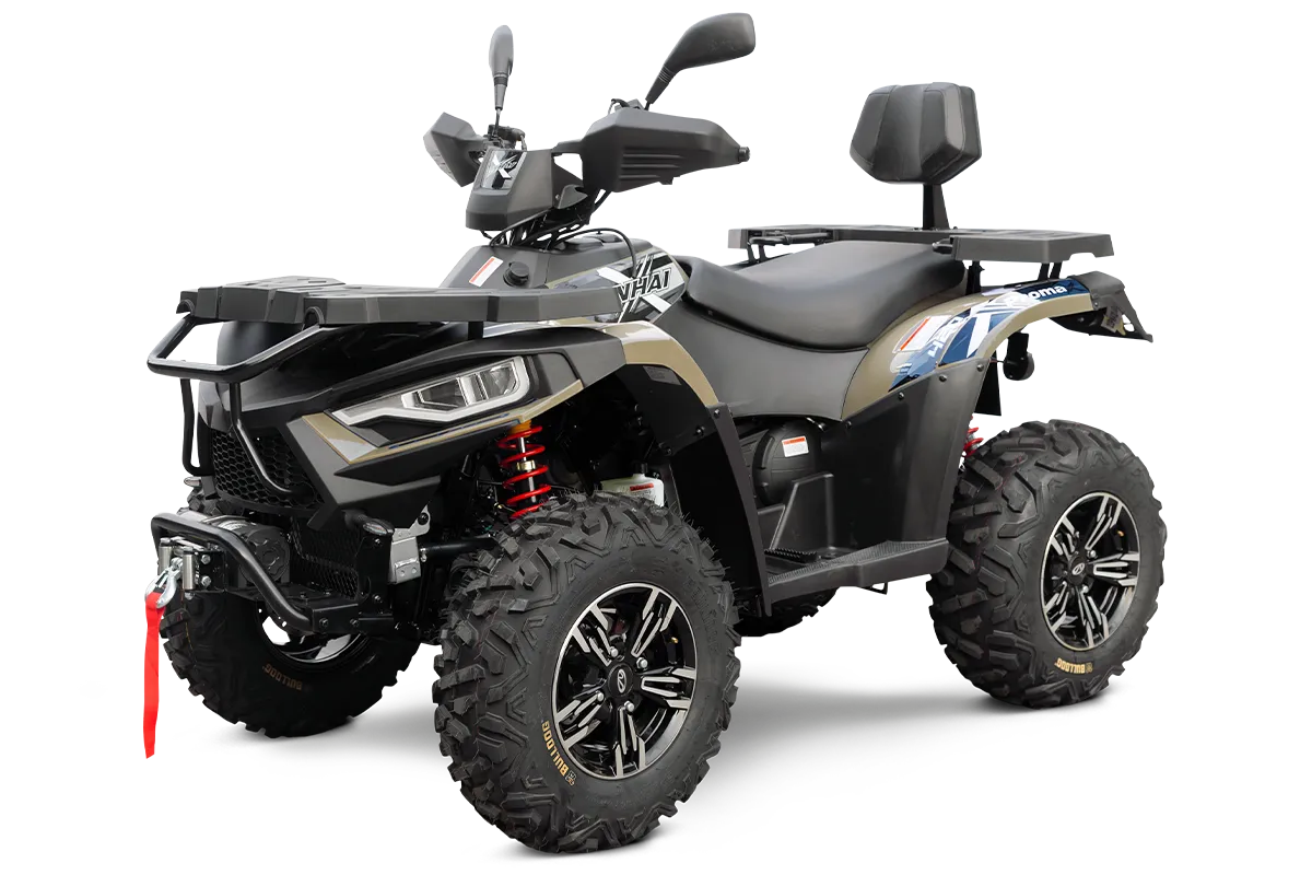 Vankka etusuojapuskuri, tukevat etu- ja takatavaratelineet, tyylikkäät alumiinivanteet ja Bulldog renkaat, sähkövinssi (3000 lbs) kaukosäätimellä, vetokoukku, käsisuojat, LED-ajovalot, LED-päiväajovalot, LED-takavalot / jarruvalot / suuntavalot, 12 V virtapistoke, äänimerkki vilkkujen käytöstä, selkänoja.